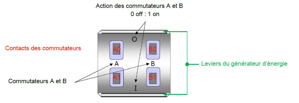 Dans tous les cas, l’organe de commande de chaque commutateur est un levier de type bascule. Par conséquent, les deux boutons poussoir d’un même commutateur ne peuvent pas être actionnés simultanément.