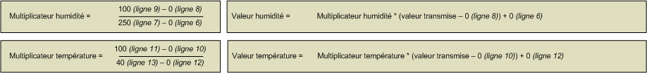 Multiplicateur température = 40/250 ; Multiplicateur humidité = 100/250 |
